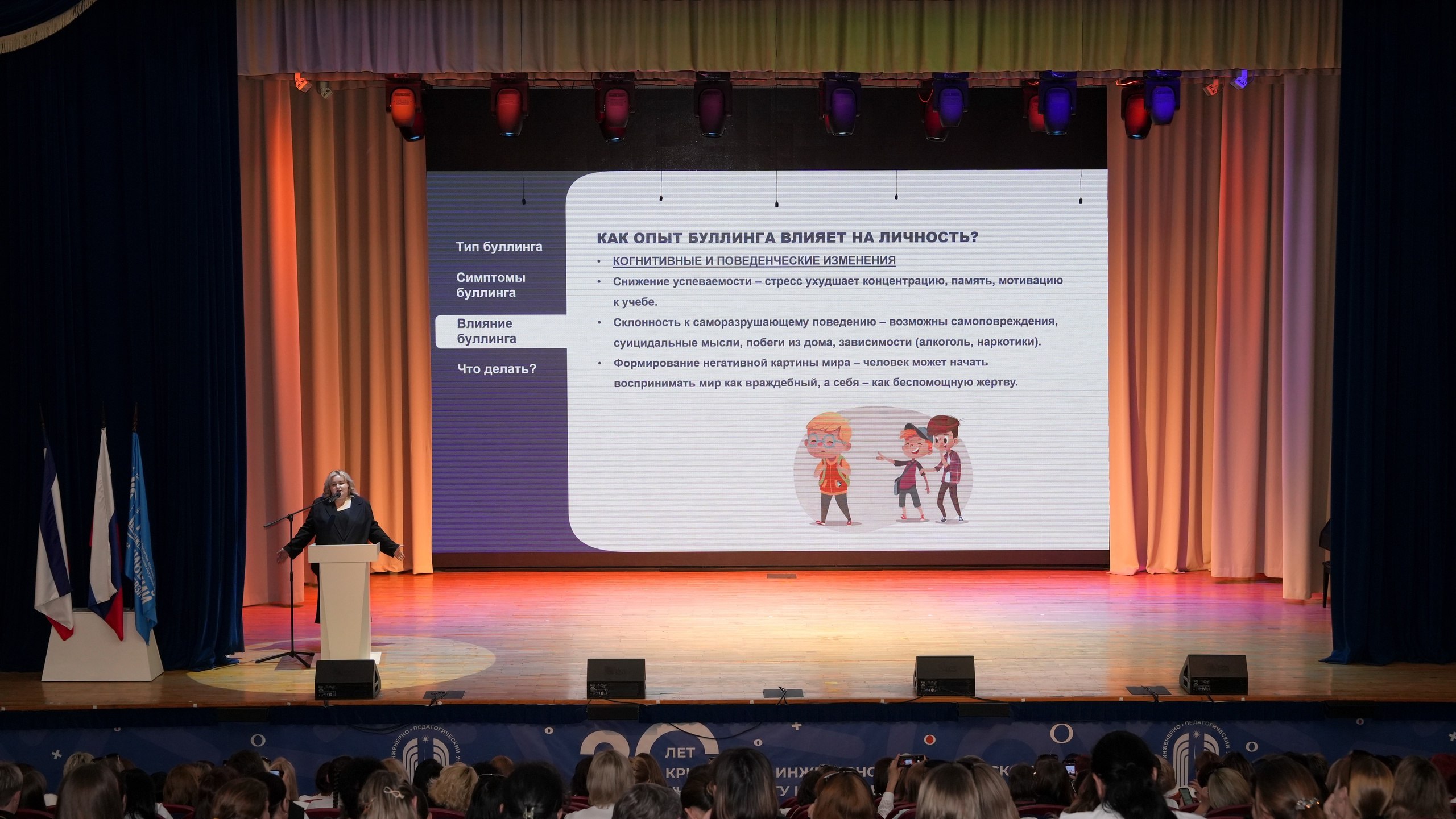 Кроме игрового формата, состоялась серия выступлений экспертов. Кандидат психологических наук, доцент Ирина Лучинкина детально рассказала о причинах возникновения школьного буллинга и его влиянии на личность ребенка.